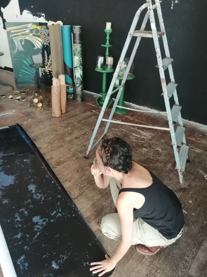 On est donc assises dans ce bus, Yana me parle des prochaines expos, des projets… Le Larvoratoire fermera ses portes trois semaines en août, le temps de faire une pause et une rénovation complète de la vitrine. « J’ai une idée… ça ne te dirait pas d’exposer tes décors ? ». Wow. Malgré le peu de neurones actifs qui me reste au lendemain d’une nuit blanche, la proposition fait tilter mon cerveau. J’imagine des bribes de scénographie, des arbres de 3 mètres de haut… Je suis néanmoins très intimidée par ce projet: les délais vont être courts, la vitrine est immense, je suis peu habituée aux dimensions verticales… J’ai demandé à Yana un petit temps de réflexion. En réalité je n’en ai pas dormi de la nuit car mon imagination était déjà à l’oeuvre. Des son côté, Yana a réalisé une maquette de la nouvelle devanture et une check-list des travaux qu’elle envisage depuis longtemps: repeindre le sol, le plafond, certains murs, installer une enseigne, accrocher du lierre, coller un grand sticker sur la vitre centrale… Je lui envoyait mes intentions de décors qu’elle plaçait sur la maquette. Certaines propositions fonctionnaient mieux que d’autres. Elle me donnait son avis, son regard averti, j’affinais au fur et à mesure… Les échanges étaient fluides, les idées fusaient, le tout sans langue de bois, dans une connivence réciproque. Magique !