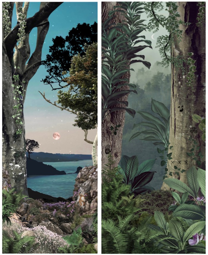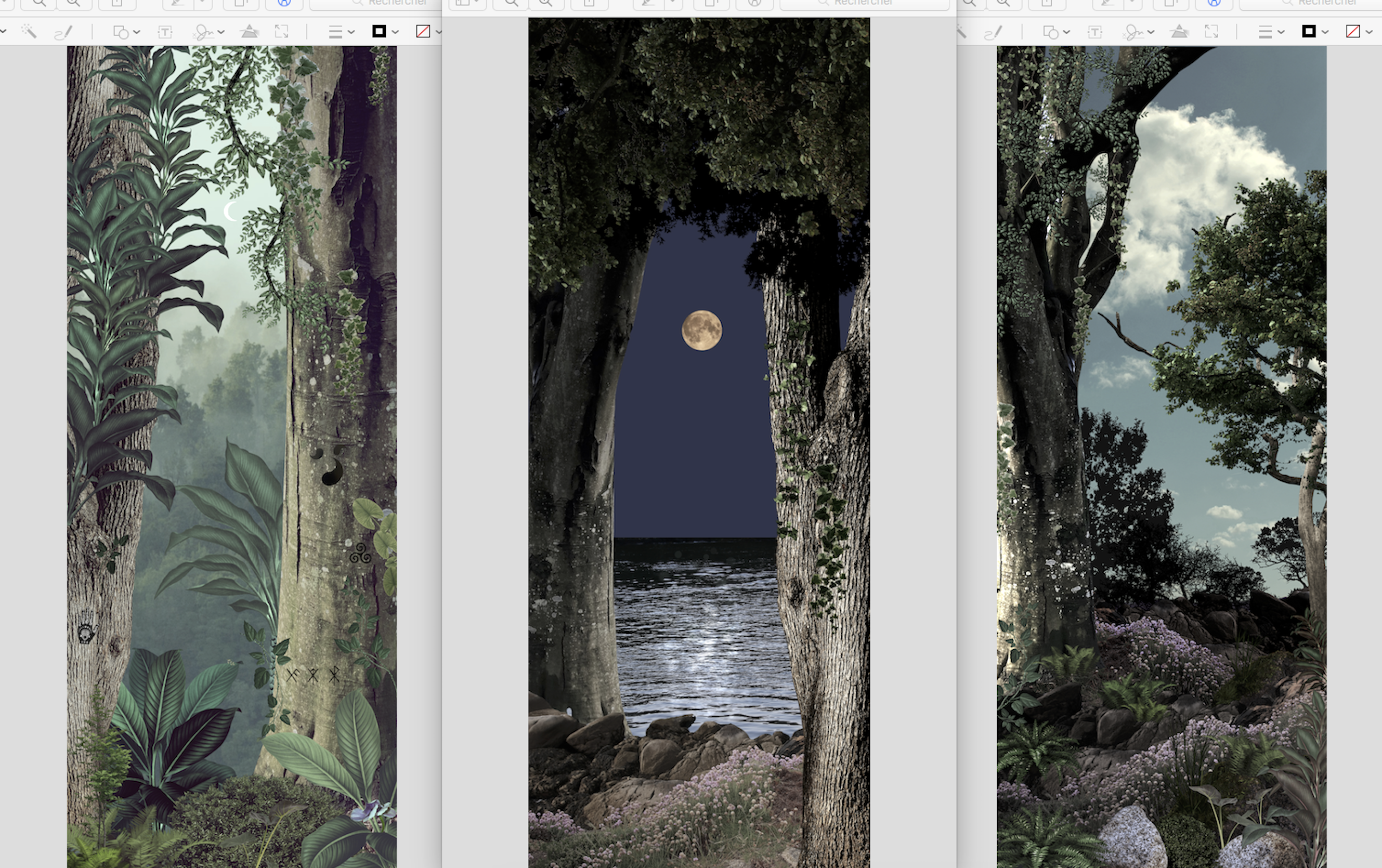 A travers ces décors, je voulais rendre hommage à Douarnenez: ses arbres centenaires des Plomarch’, son granit du Flimiou, sa baie aux teintes surréelles dans laquelle baigne la légende D’Ys… J’avais envie de créer un univers de densité végétale et un univers contemplatif ou le regard peut venir se (re)poser sur un horizon lunaire. Je travaille à partir de photos prises sur les lieux qui m’inspirent, puis je « découpe » ces images et je les recompose en y ajoutant des gravures, de la peinture (numérique). Sur l’image au-dessus, vous voyez mes premières intentions. Yana opte pour la 1ère et la 3ème image. On garderait la nuit de pleine lune pour le sticker central. Super idée ! Pourtant je ne suis pas satisfaite: je trouve la 3ème image trop réelle… De plus, il faut que je sature et contraste un peu plus les couleurs car le reflet de la vitre va « blanchir » les teintes le jour et les rendre ternes la nuit. Je recommence et lui fait une nouvelle proposition plus affirmée: