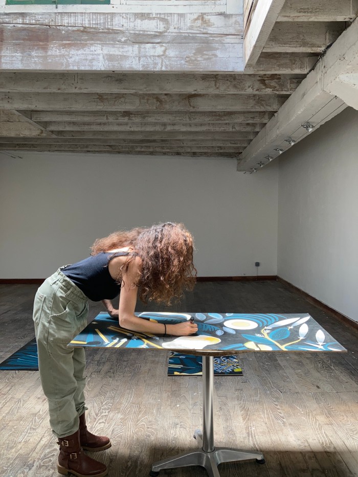 Voilà qui ressemble plus à l’idée que j’avais en tête ! Yana me dit banco. Commence alors un loooooong travail de retouches numérique où je retravaille chaque décor cm3 par cm3 à la palette graphique pour estomper la frontières entre photo et peinture. C’est comme cela que je procède pour chaque décor, chaque commande. D’habitude il me faut une semaine, là j’ai juste 3 jours pour faire deux panoramiques et les envoyer direct chez mon imprimeur afin d’être livrée à temps. Yana fait imprimer le sticker pour la vitrine centrale (je lui ai envoyé plusieurs versions colorielles d’une canopée pleine lune). Entre temps, nous commençons une semaine de travaux. Beaucoup de joie, de sérenité, d’efficacité et cette même façon de prendre le temps du recul pour chercher la bonne façon de faire les choses. Toute cette belle aventure créative prend une belle amplitude et cela me réjouit. J’ai tendance à croire que les lieux sont chargés de nos intentions et de nos énergies…