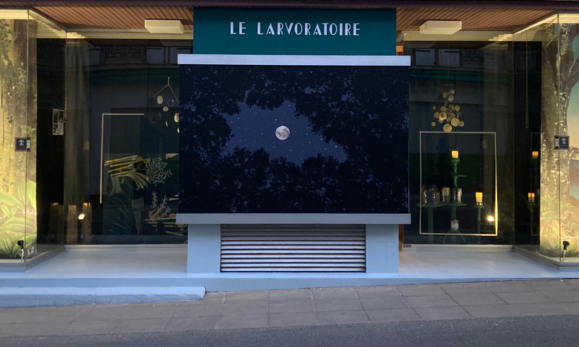Le jour-J, mes amis Coco et Thomas sont venus à la rescousse pour la pose du sticker XXL. C’était la dernière étape un peu délicate à réaliser, relevée à 8 mains ( + 3 spatules + 2 escabeaux). A la tombée du jour, j’ai accroché les panoramiques et disposé les divers éléments dans les vitrines comme de mini cabinets de curiosité: guéridons, suspensions, paravent, lampes et bougies LED… J’avais tout pensé et préparé en amont, il ne restait qu’à disposer le tout dans les vitrines. Néanmoins, j’avais les mains qui tremblaient un peu de trac, de stress, d’émotions. Qu’est ce que tout cela allait donner ? Est ce que ma vision de départ allait coller à la réalité ?
