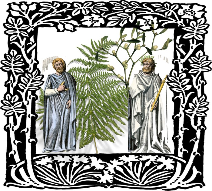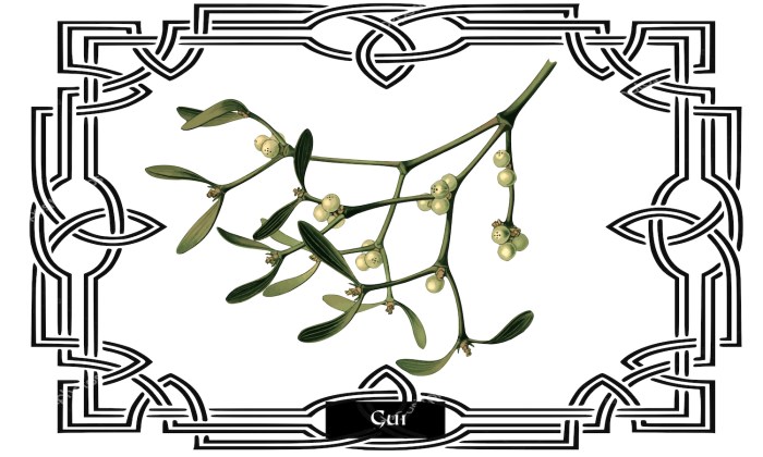 Plante sacrée des druides, le gui est symbole de l’éternité du monde et de l’immortalité de l’âme. Ce sont ses feuilles qui étaient utilisées dans les cataplasmes et breuvages médicinaux (ses baies sont très toxiques). Il était coupé le premier jour du solstice d’été ou lorsque la Lune avait 6 jours pour se protéger contre la malchance. En le coupant, les druides disaient « O Ghel an Heu ! » qui signifie « Quel le blé germe ! ». On raconte que toute amulette à base de gui est protectrice: la présence de gui dans une habitation est synonyme de paix et de bonheur. Posée près de la porte de la chambre à coucher, placée sous l’oreiller ou suspendue au dessus de la tête du lit, une branche de gui assurerait un sommeil réparateur et de beaux rêves. Et pour éviter les maladies, on portait une bague sculptée dans du bois de gui.
