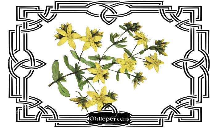 Mentionné dans les écrits de Galien, Pline l’Ancien, Hippocrate et Parcelse, le millepertuis, alias « l’herbe de Saint-Jean » était très utilisé au Moyen Âge pour soulager les embarras digestifs, traiter les brûlures, les problèmes urinaires, les douleurs menstruelles, l’anémie… Cueilli au matin de la Saint-Jean, au plus fort des influences solaires, il était utilisé pour repousser l’esprit des ténèbres et guérir les possédés. On cueillait des branches de millepertuis, avec des graines, le jour de la Saint-Jean puis, on faisait avec ces branches des croix que l’on attachait aux portes des maisons, des étables, pour les préserver de tout maléfice, les bouquets, gardés précieusement, étaient jetés au feu de la Saint-Jean de l’année suivante. On dit que si il est cueilli aux environs du 21 Juin il soigne la mélancolie et lorsqu’il est mis dans un vase sur un rebord de fenêtre, il protège contre la foudre, le feu et les mauvais esprits.