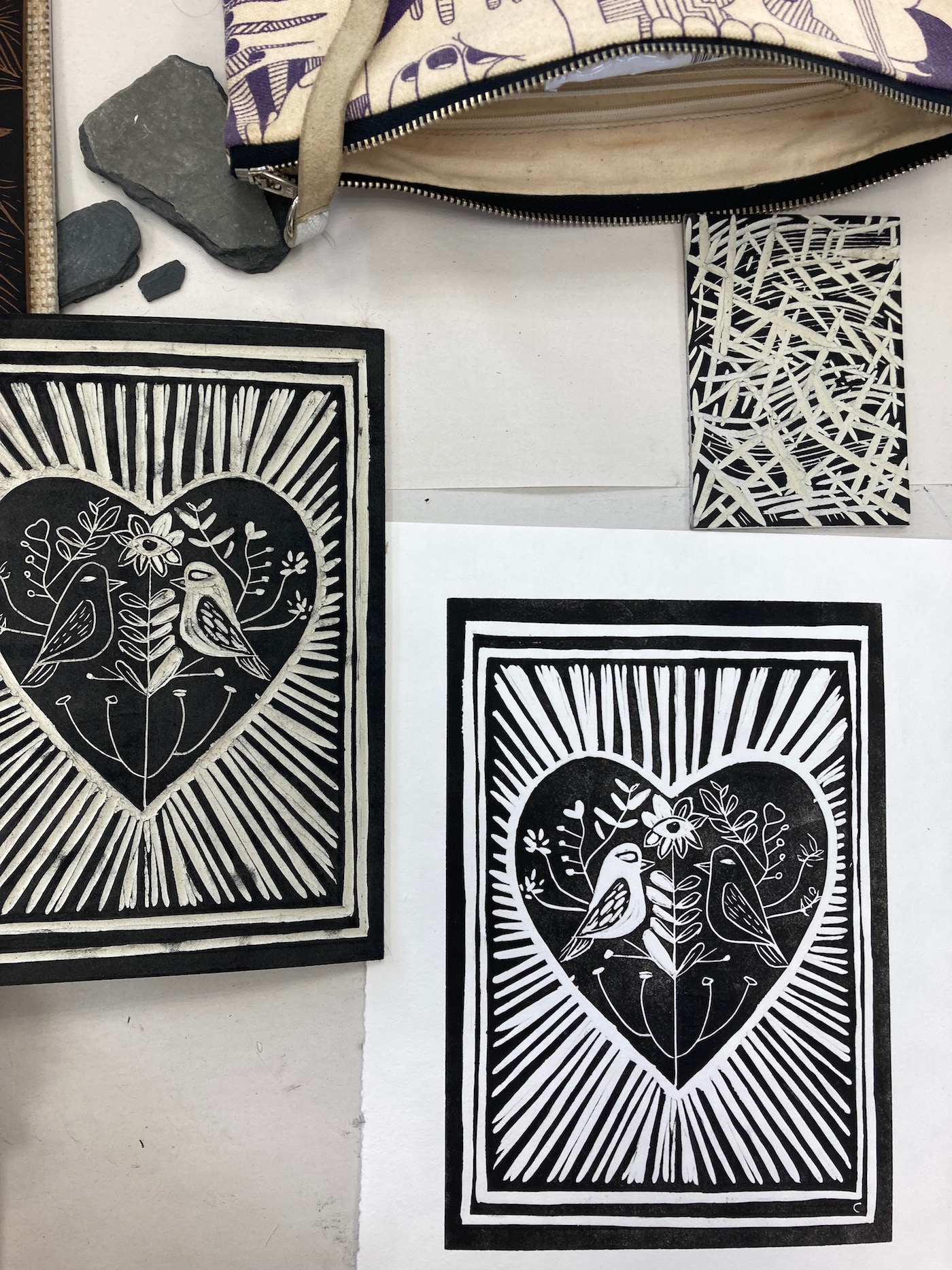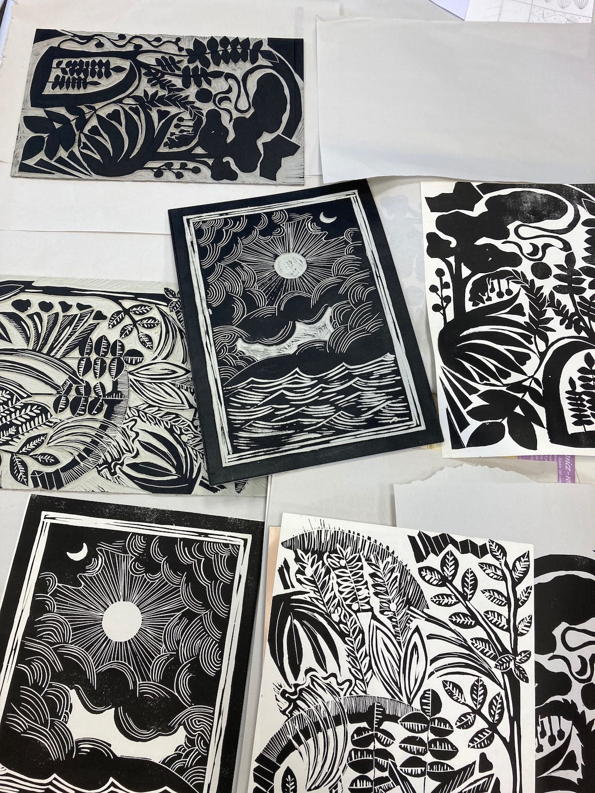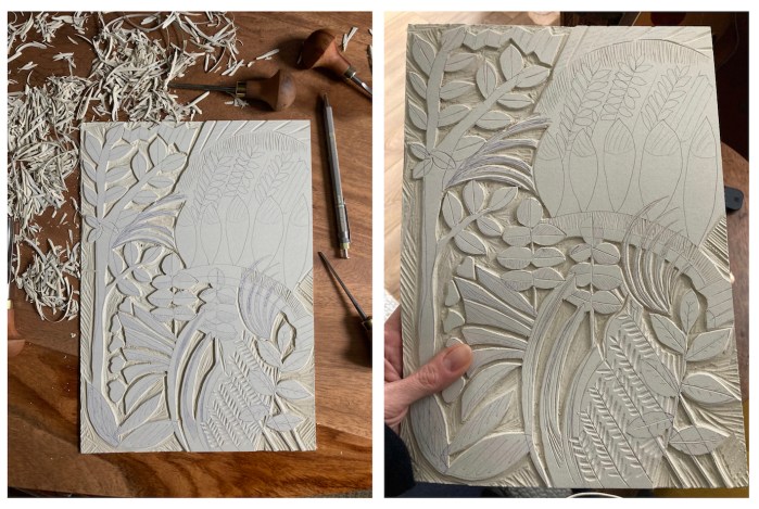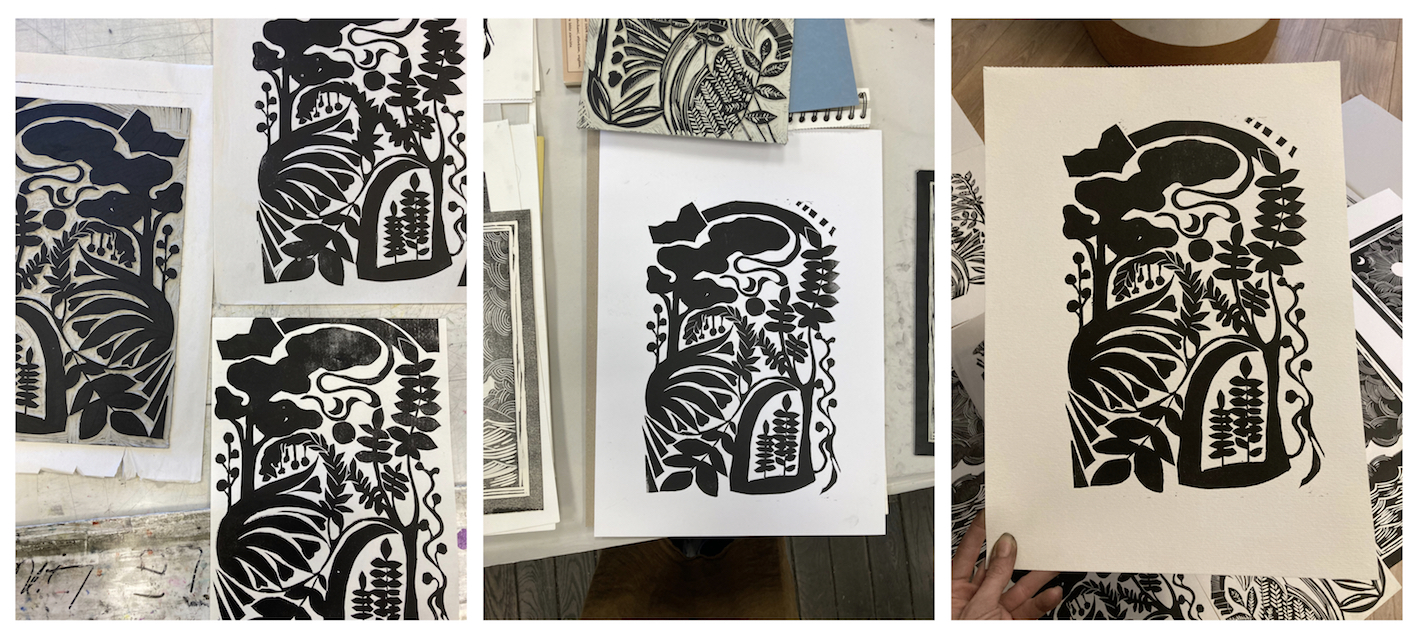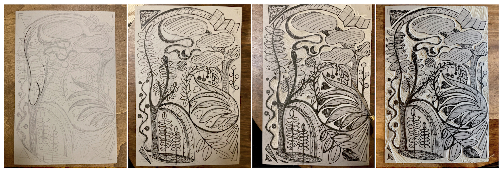 Tout commence par une idée de dessin ou de motif. Il faut le penser en inversé car il sera imprimé en miroir. Je réalise un premier tracé au crayon, puis parfois un second au feutre noir pour bien suivre les découpes. ensuite il faut creuser ! Ce travail demande 2, 5, 10 heures… ou plus, selon la taille de la plaque et la complexité du motif. Avec des gouges de différentes tailles, j’élimine de la matière. Seuls les reliefs seront imprimés. Voici quelques exemples d’évolution: