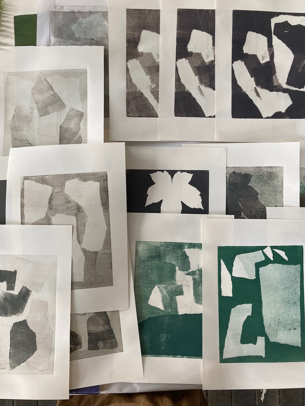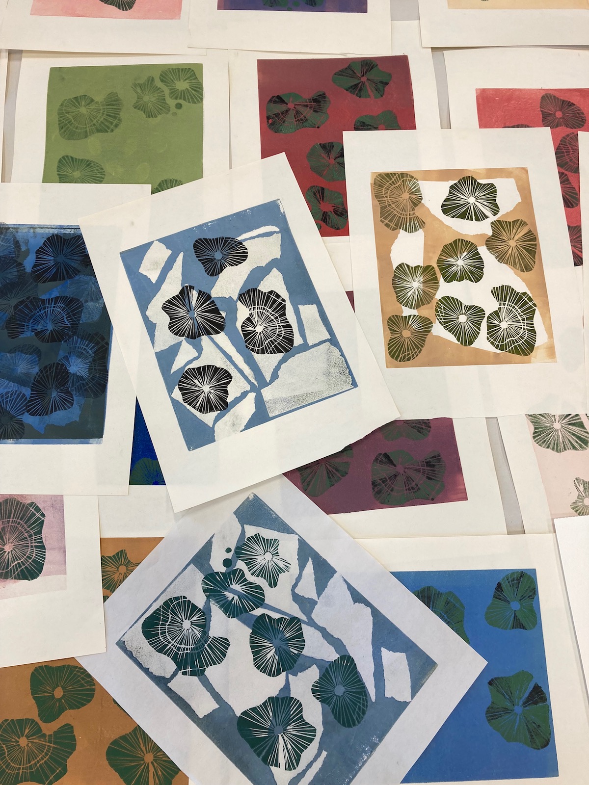 J’aime bien l’encre noire car elle se prête à tous les motifs et possède un rendu intemporel, mais depuis quelques temps je travaille avec des encres de couleurs. Soit pour créer des fonds, soit pour réaliser des monotypes (des procédés d’impression sans gravure). Dans ce cas, il faut plusieurs passage successifs sous la presse: encrer une plaque entière avec une teinte (des fois je mets des heures avant de trouver le bon mélange couleur !), puis appliquer des pochoirs, puis apposer des petites plaques gravées… Le tout en essayant de ne pas dépasser du cadre !