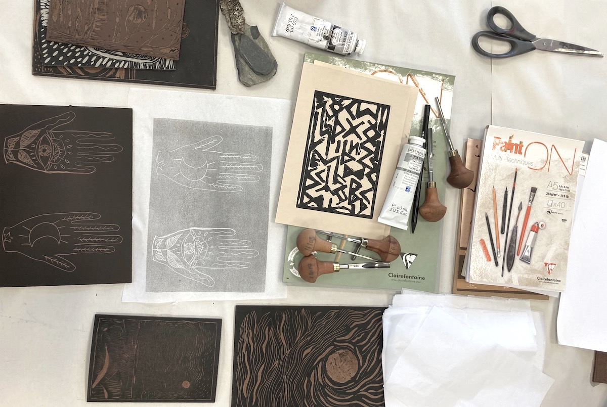 Je parle ici de linogravure (réalisée sur plaque de lino) mais il existe pleins d’autres supports: la xylogravure (sur plaque de bois), la gravure en taille douce (sur rhénalon, Tetra-pack, sur plaques de cuivre ou de zinc) et autant de procédés pour creuser une image dans la matière et réaliser des tirages multiples sur papier. Certaines gravures s’effectuent à l’aide de gouges (des ciseaux creusés en gouttière), d’autres avec une pointe sèche, d’autres encore avec un « mordant » chimique (comme l’eau-forte, la manière noire, l’aquatinte,..).