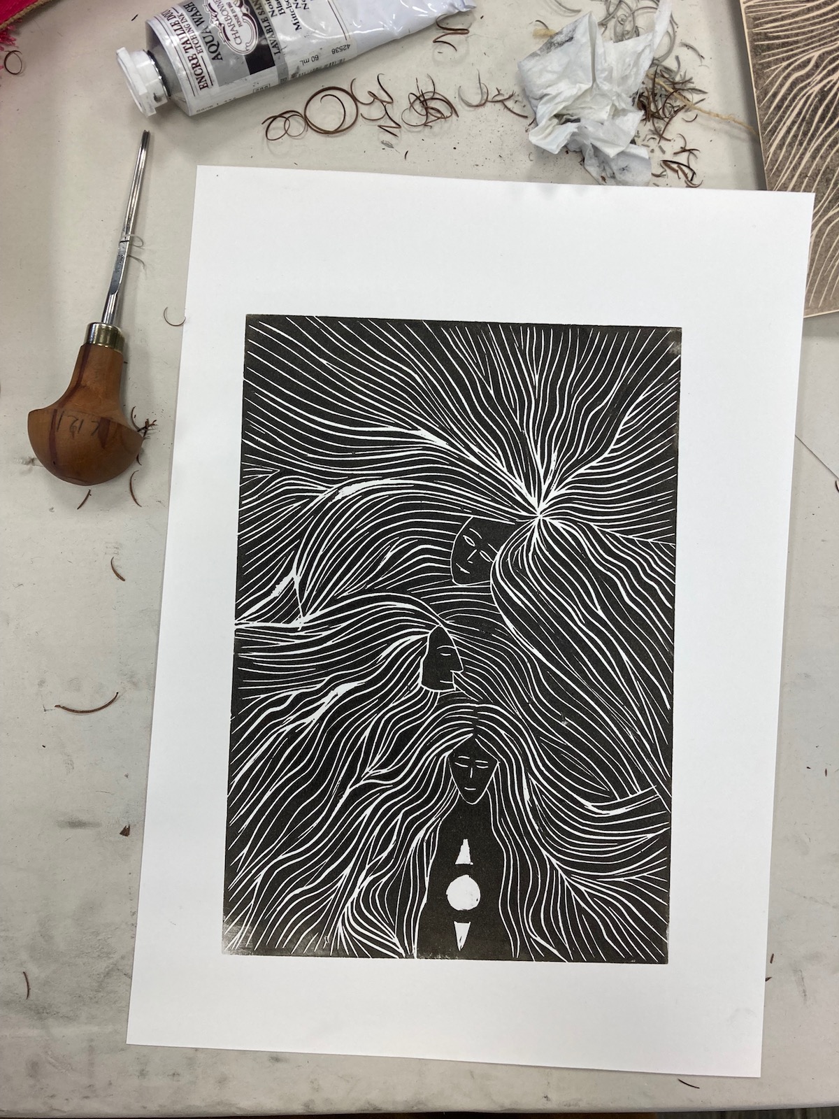 Cela fait maintenant trois ans que j’apprends cette technique aux Beaux-Arts de Quimper. J’ai déjà gravé sur des plaques de bois, mais la plupart du temps je grave sur des plaques de lino. J’aime bien cette matière assez tendre qui se creuse relativement facilement et ne nécessite pas de matériel complexe.