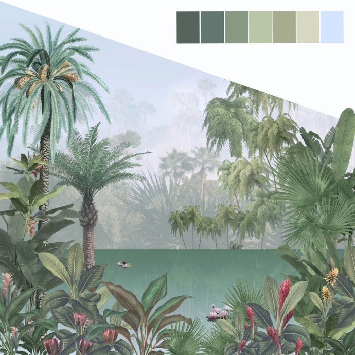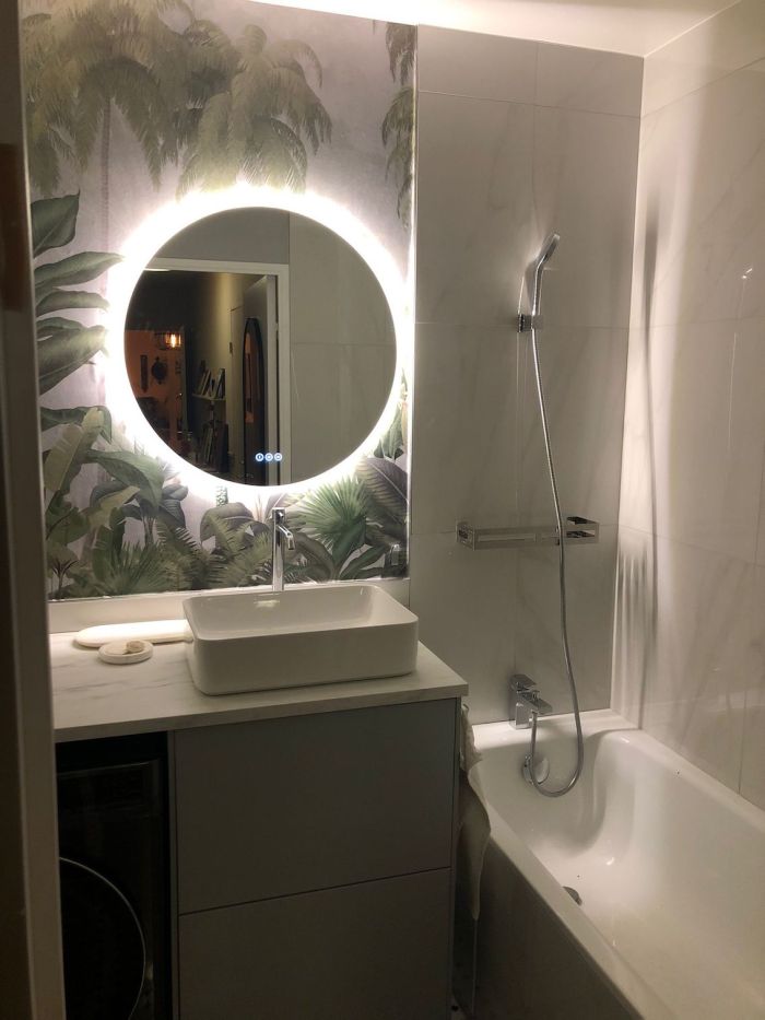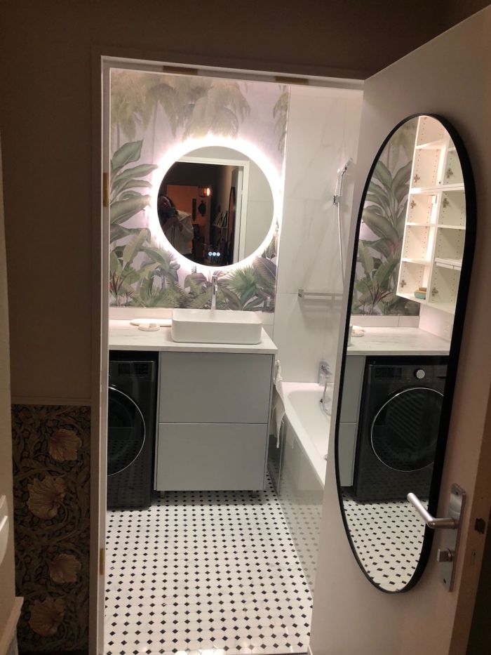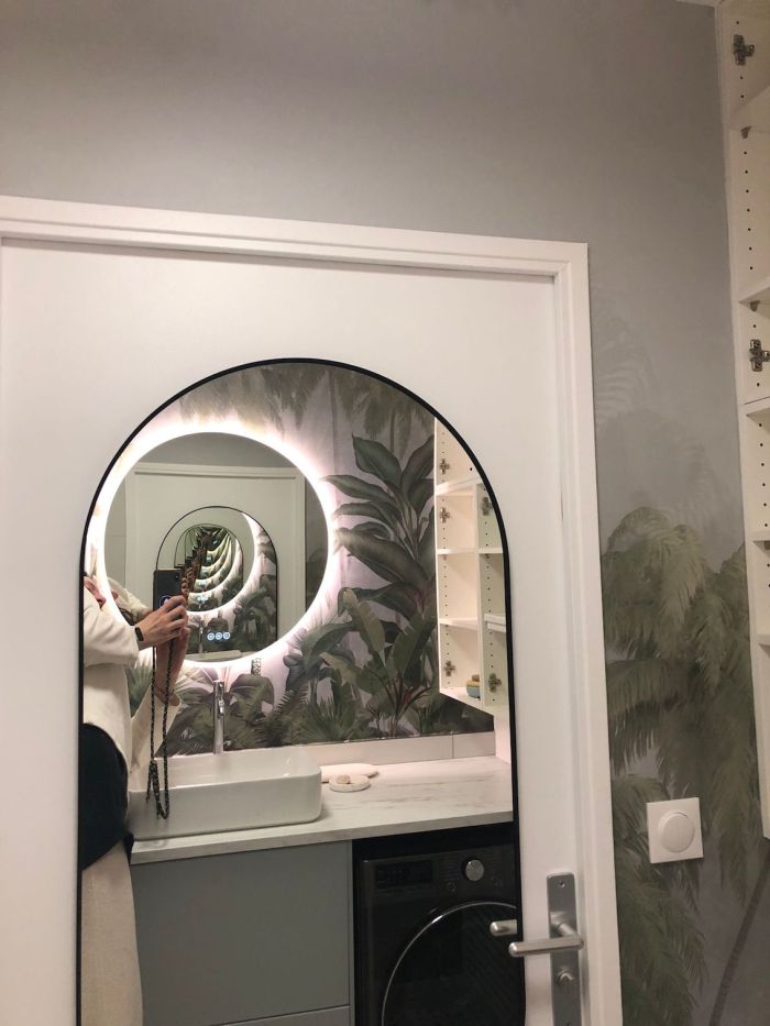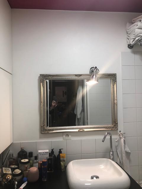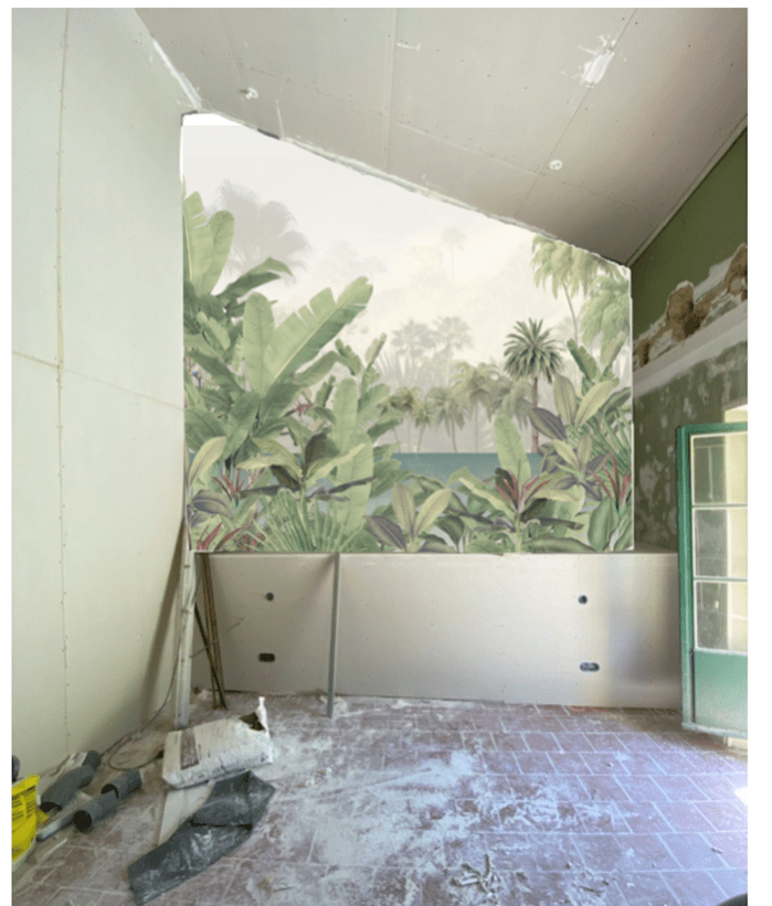 La propriétaire adorait le décor JANGLENN et souhaitait le transposer dans sa salle de bain. Je lui ai proposé une version modifiée du décor existant, en prenant en considération le grand miroir central. Comme la contrainte majeure est d’habiller une pièce d’eau, j’ai fait imprimer le décor sur un canevas vinyle qui ne craint pas l’humidité…