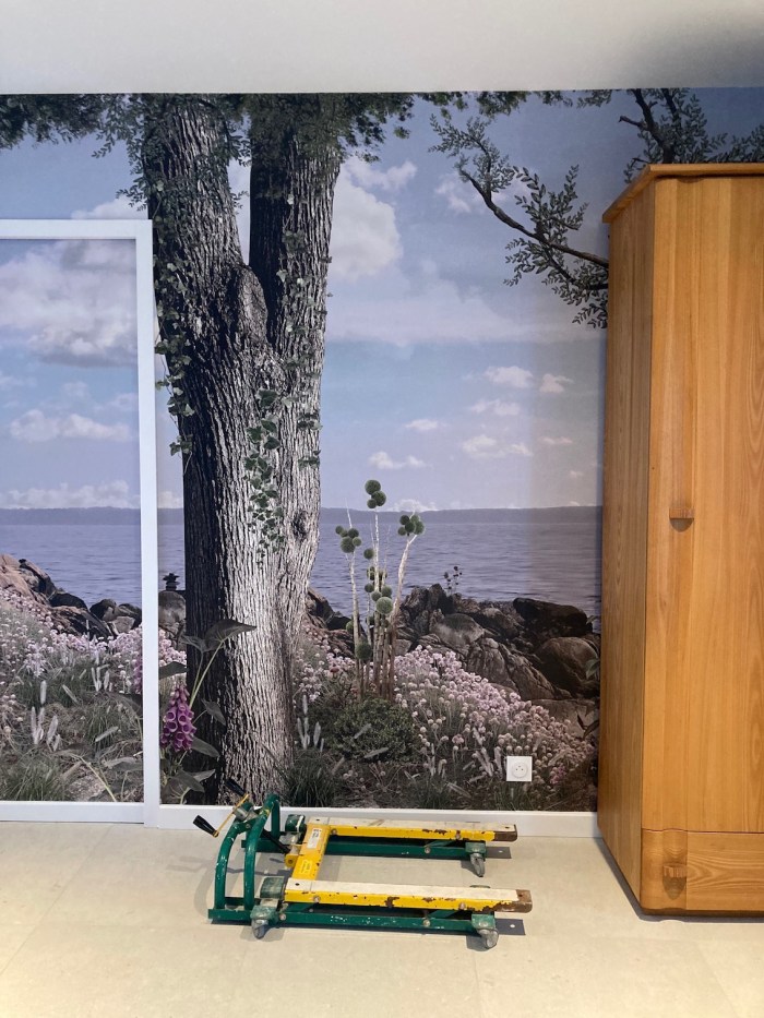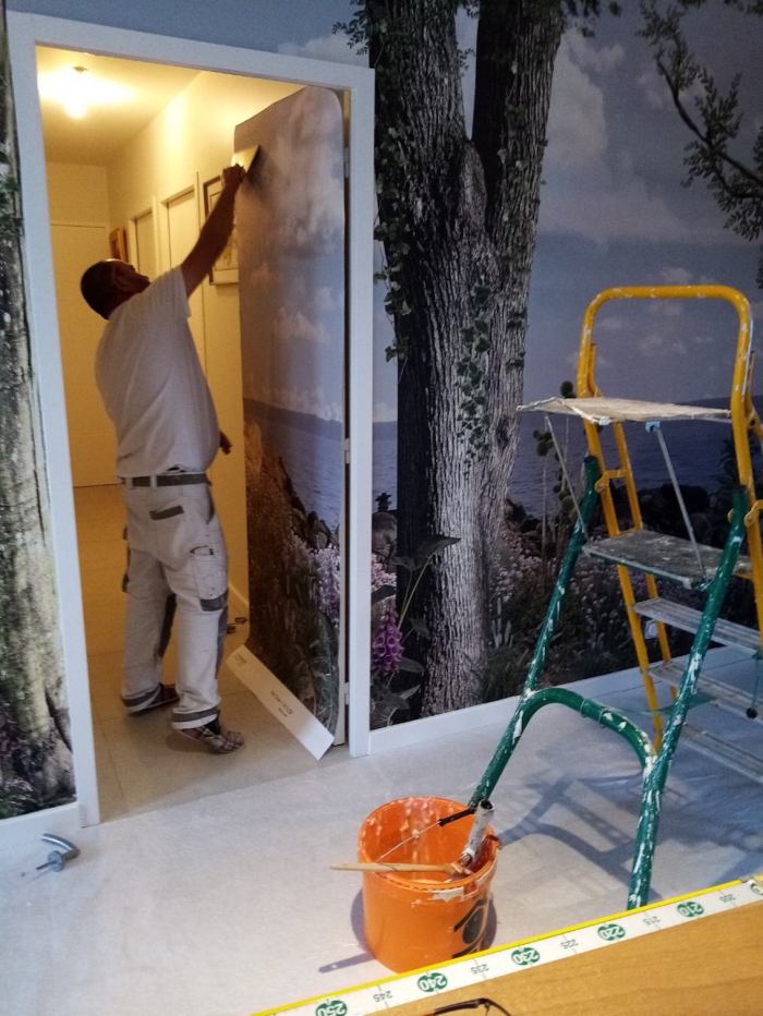 Mon plus grand challenge ! Habiller un mur de 7m de longueur. Les propriétaires voulaient décorer leur grande pièce à vivre avec un panoramique qui donne l’impression d’avoir vue sur le littoral. Après leur avoir soumis plusieurs intentions (avec plus ou moins de feuillage), ils ont choisi une version entre mer et ciel. Il a également fallu trouver une astuce trompe-l’oeil pour faire disparaitre la porte située en plein milieu. Je leur ai proposé de l’encadrer entre deux arbres…