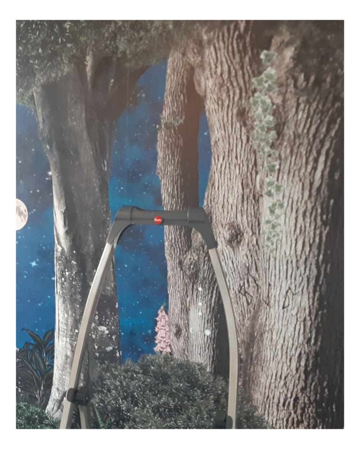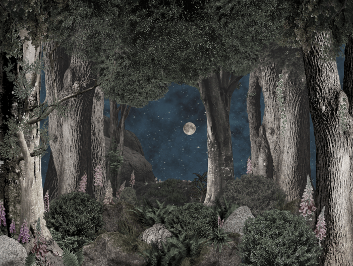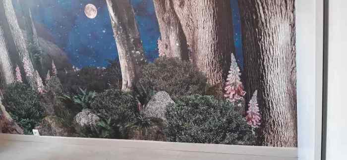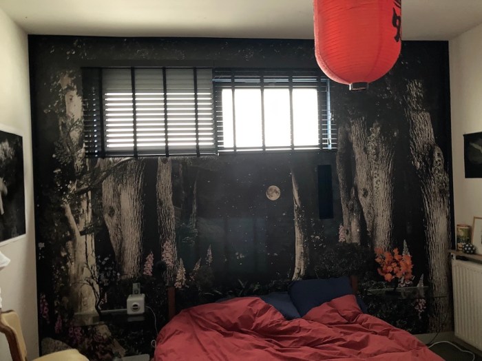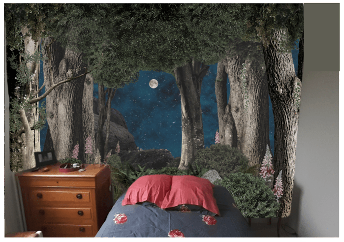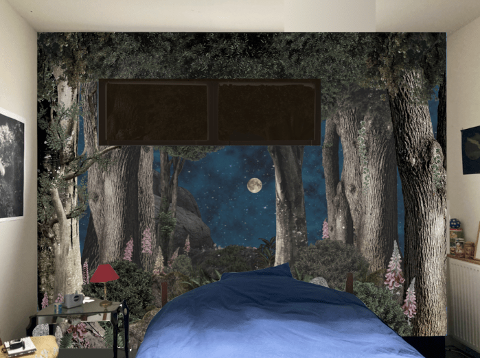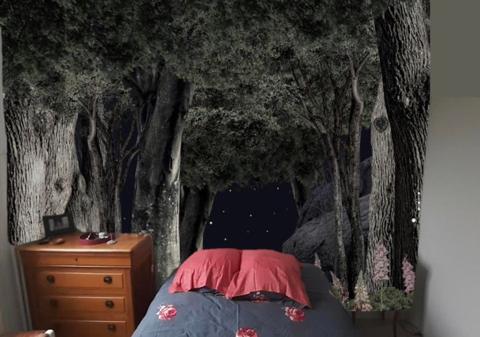 Ici, il fallait jouer avec la contrainte d’une large baie vitrée en contre-jour et une niche verticale. Il a fallu que je modifie le décor de base afin de déplacer la lune, la chouette et ajouter du feuillage pour encadrer la baie. J’ai ensuite abaissé les teintes et augmenté le contraste pour obtenir une forêt très nocturne. Pour ajouter de la profondeur, je lui ai conseillé de peindre l’encadrement du mur en bleu nuit afin de créer un coffrage. Sa chambre est désormais transformée et il ne lui reste plus qu’à remplacer la suspension rouge par une autre qu’il va fabriquer avec des branches…