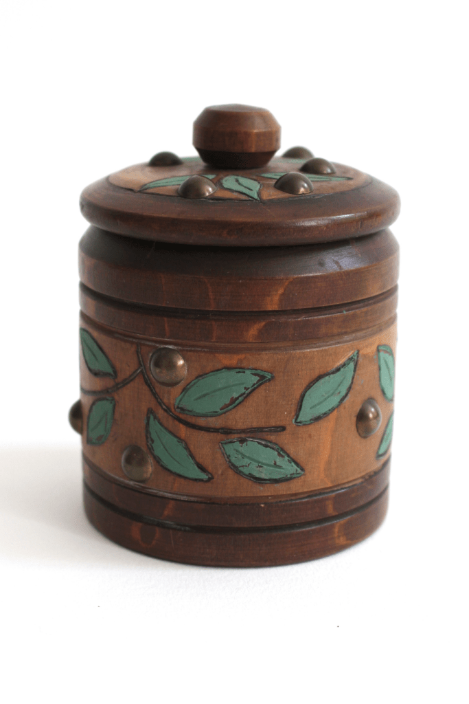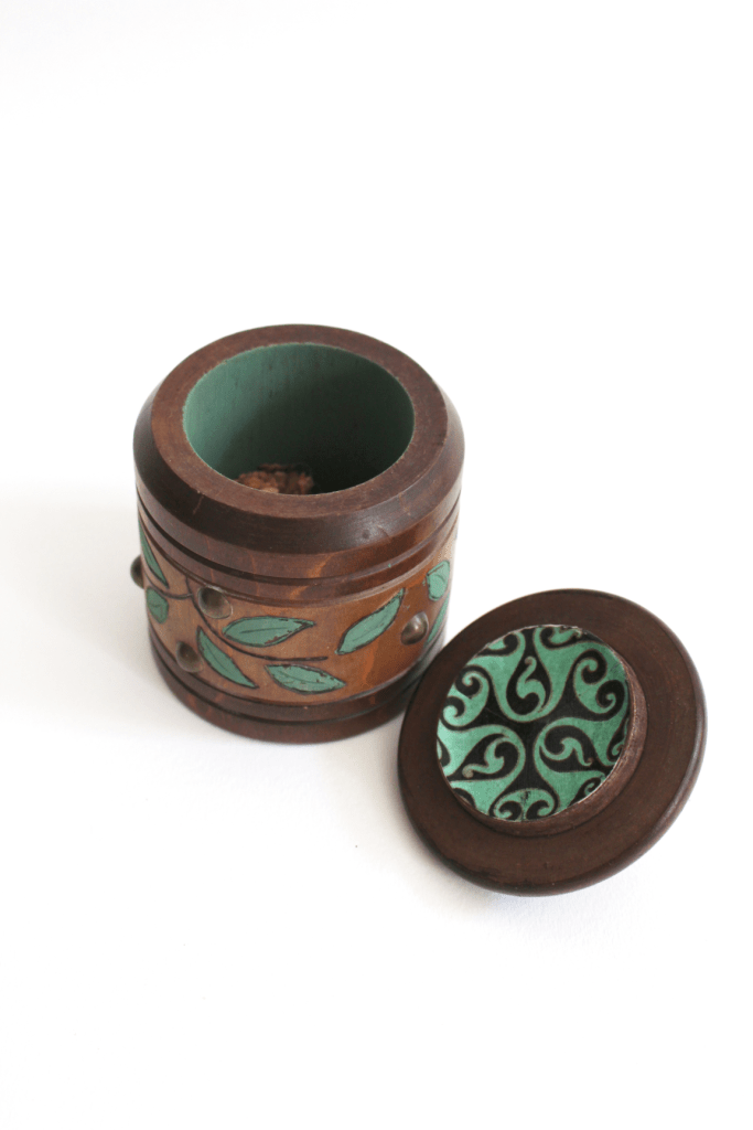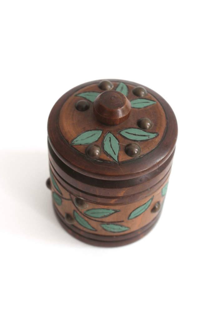 Un petit pot en bois tourné, sculpté de feuilles de laurier et clouté de laiton.