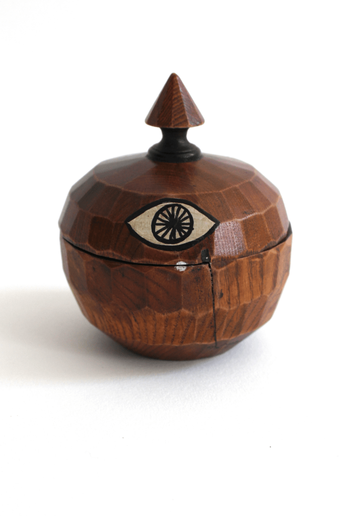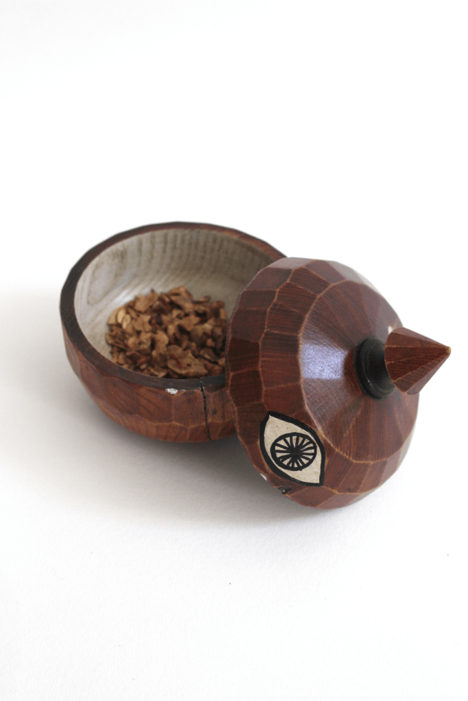 Sa forme citrouille est assez atypique. Longuement restaurée (on voit encore des petites cicatrices), elle ne s’ouvre que si on aligne le point blanc sur son couvercle . Parfaite pour ranger des secrets !