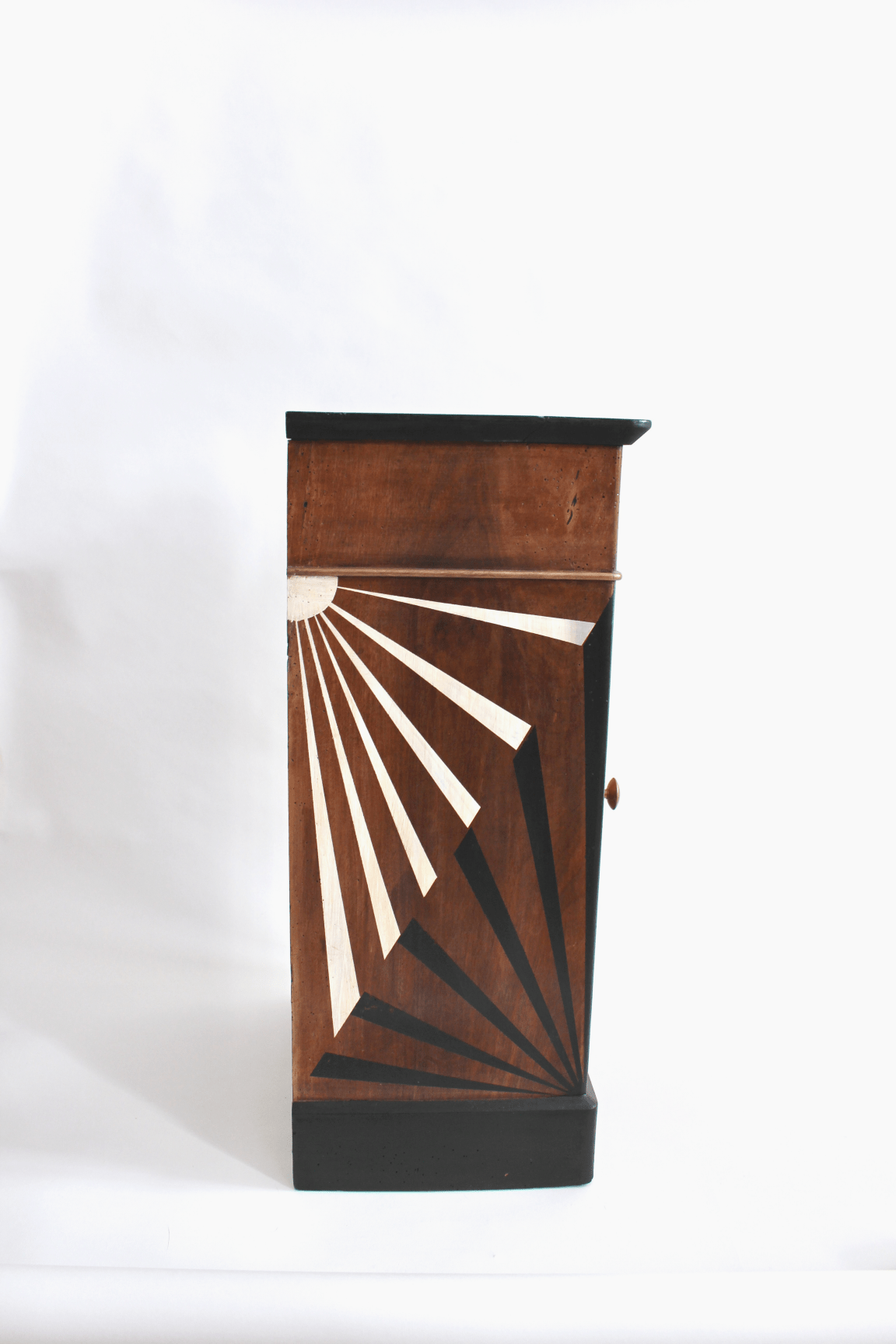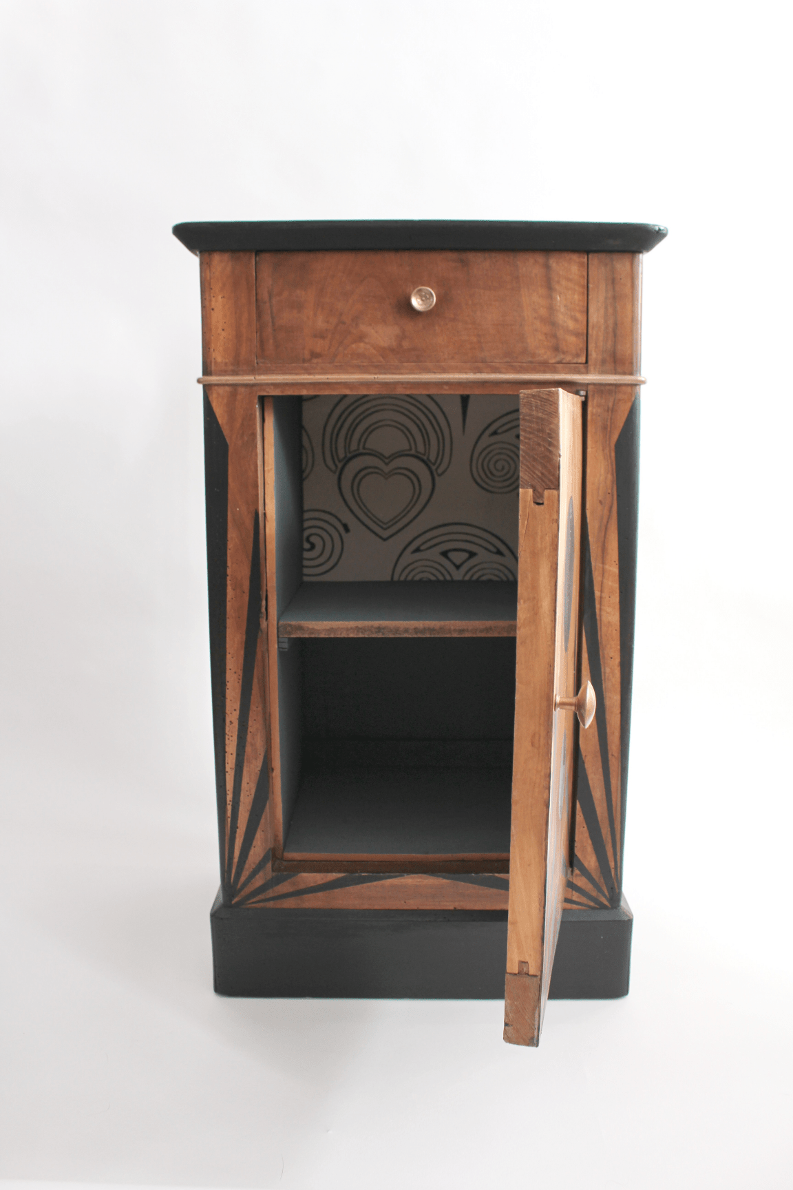 Un ancien meuble de chevet qui sert de meuble d’appoint ou de meuble à oracles. Le décor du plateau est conçu pour des tirages de runes, d’oghams ou de pendule.