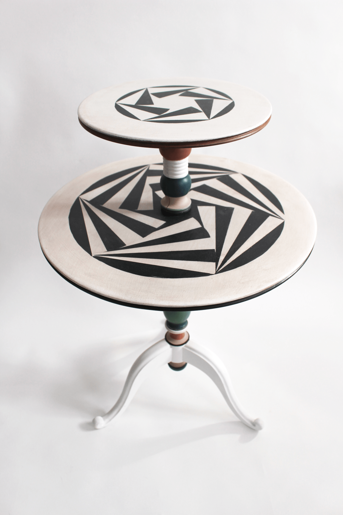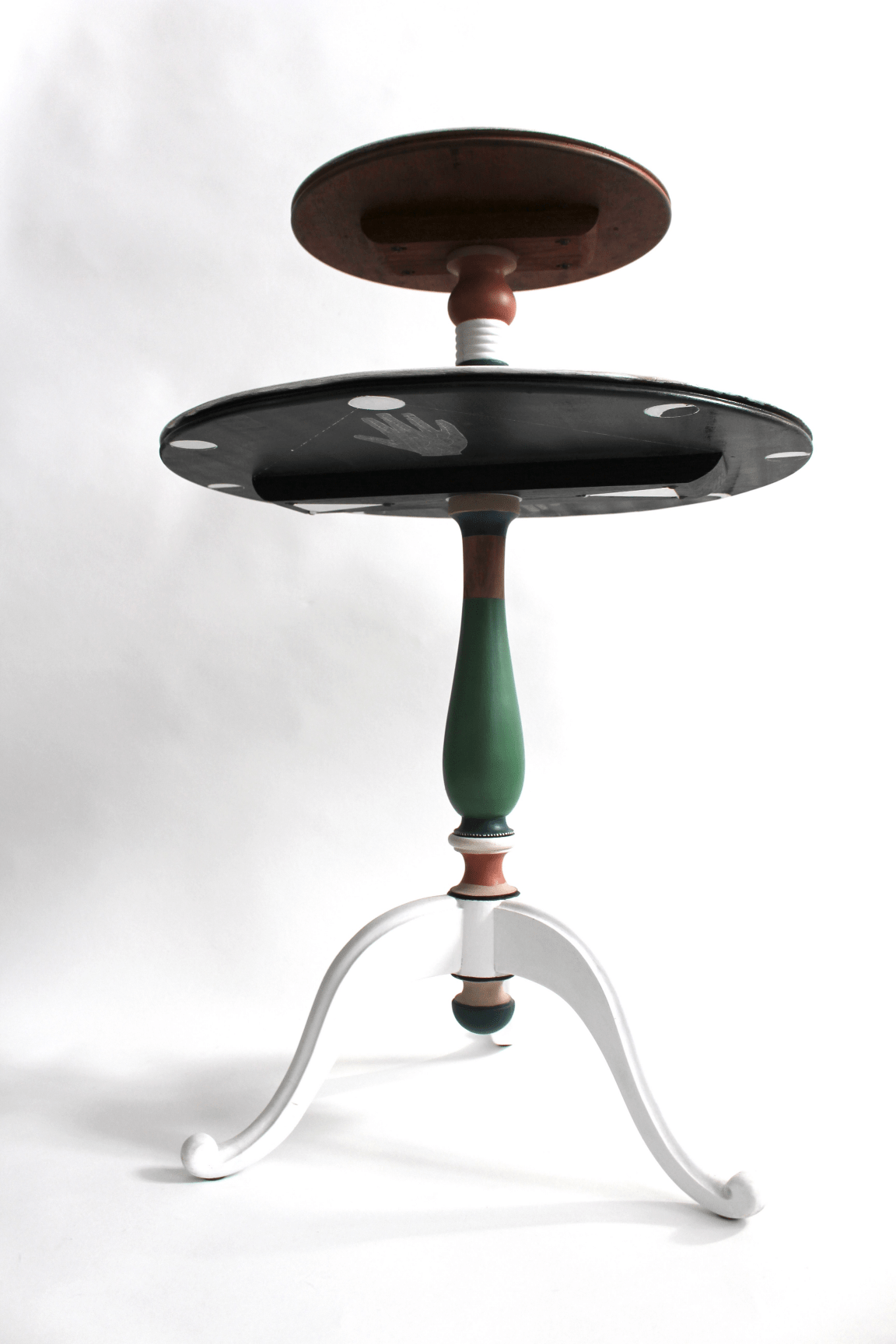 Un guéridon qui voit double. Ses plateaux superposés sont patinés avec une lasure teintée. Les pièces en bois tourné sont peintes à la main et si vous l’inversez, vous découvrirez des décorations secrètes…