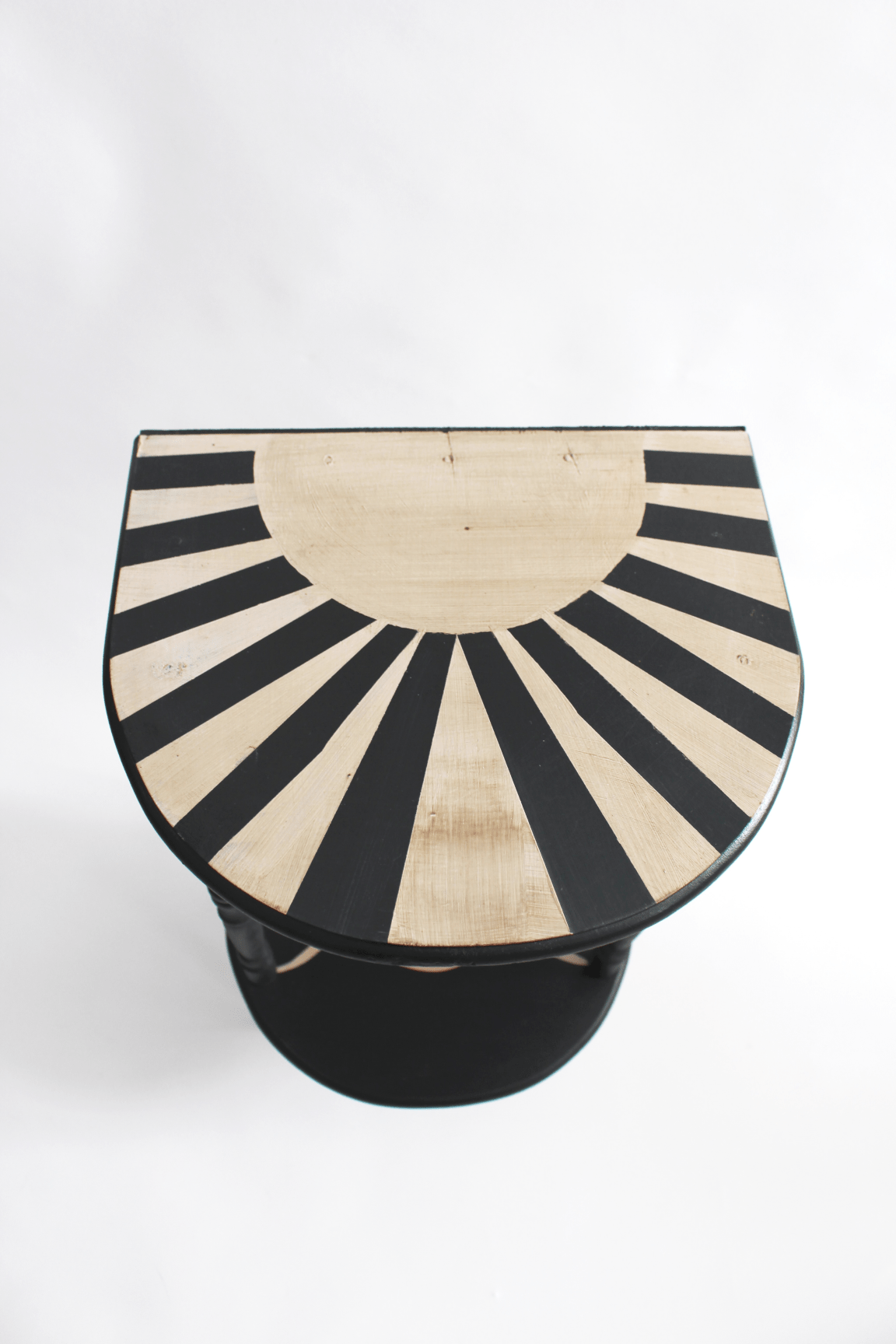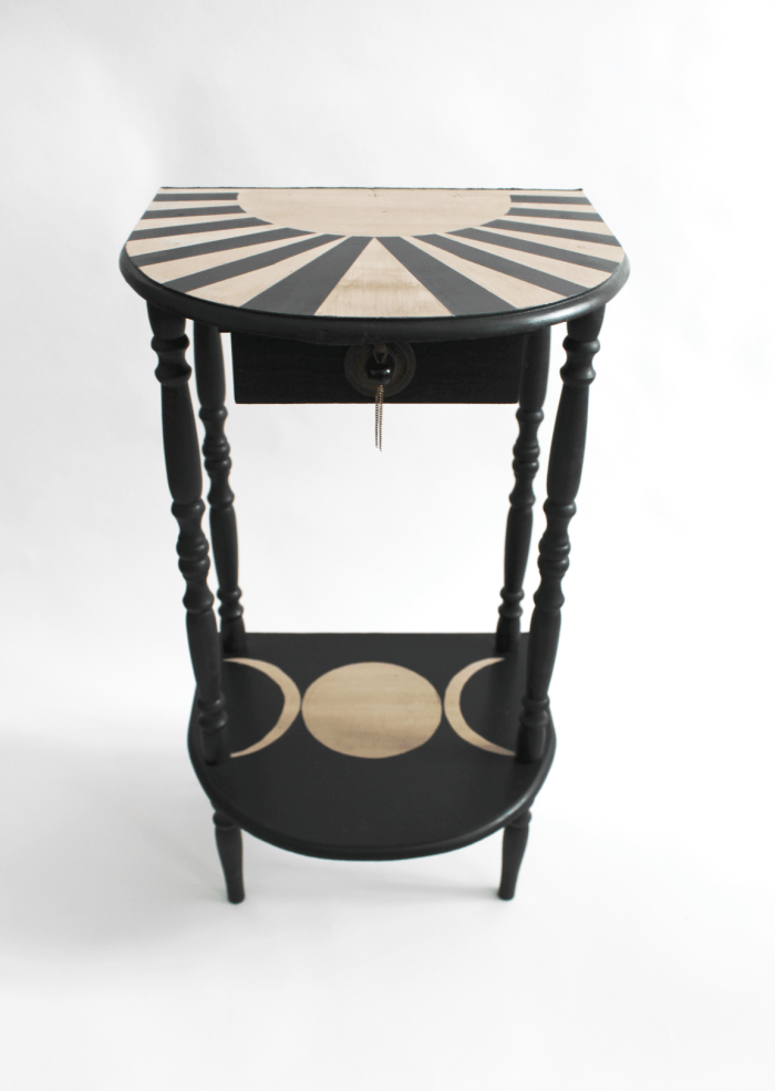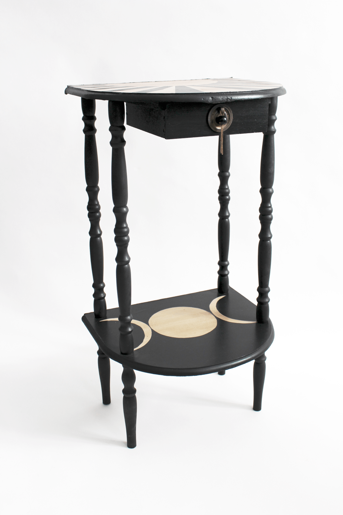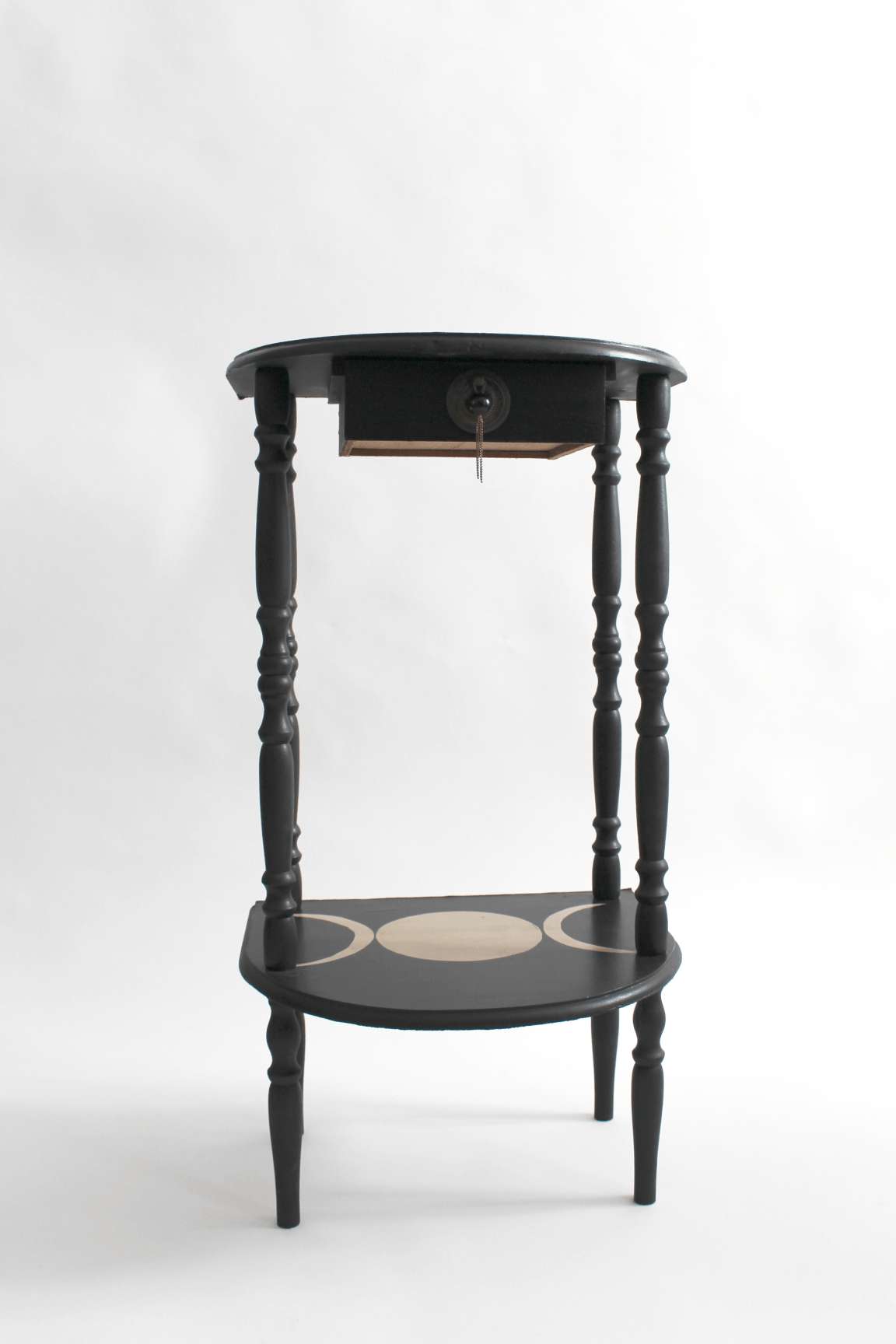 Un chevet ancien dont les pieds en bois tourné et les plateaux courbes en font une pièce élégante et atypique. Restauré, lasuré et peint à la main, il possède un petit tiroir avec ferronnerie en laiton d’origine. En chevet ou console d’appoint, il trouvera facilement sa place en dans une chambre ou une entrée.