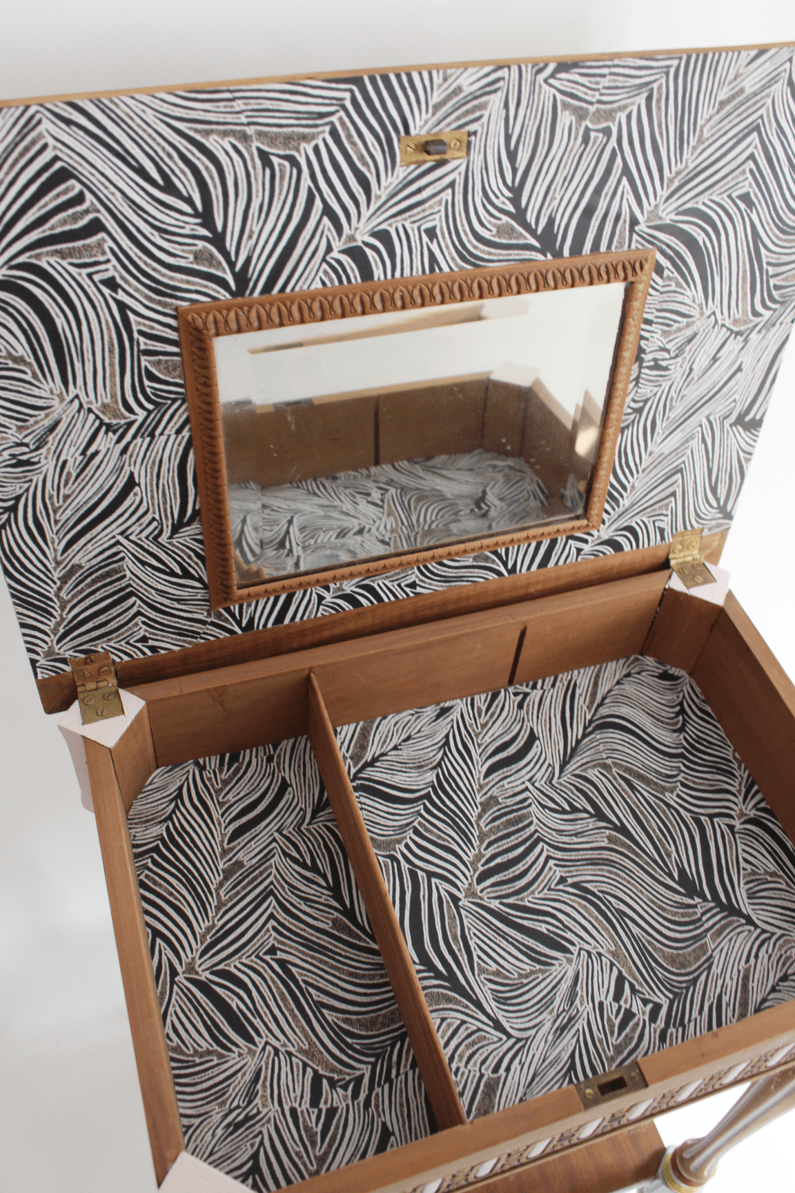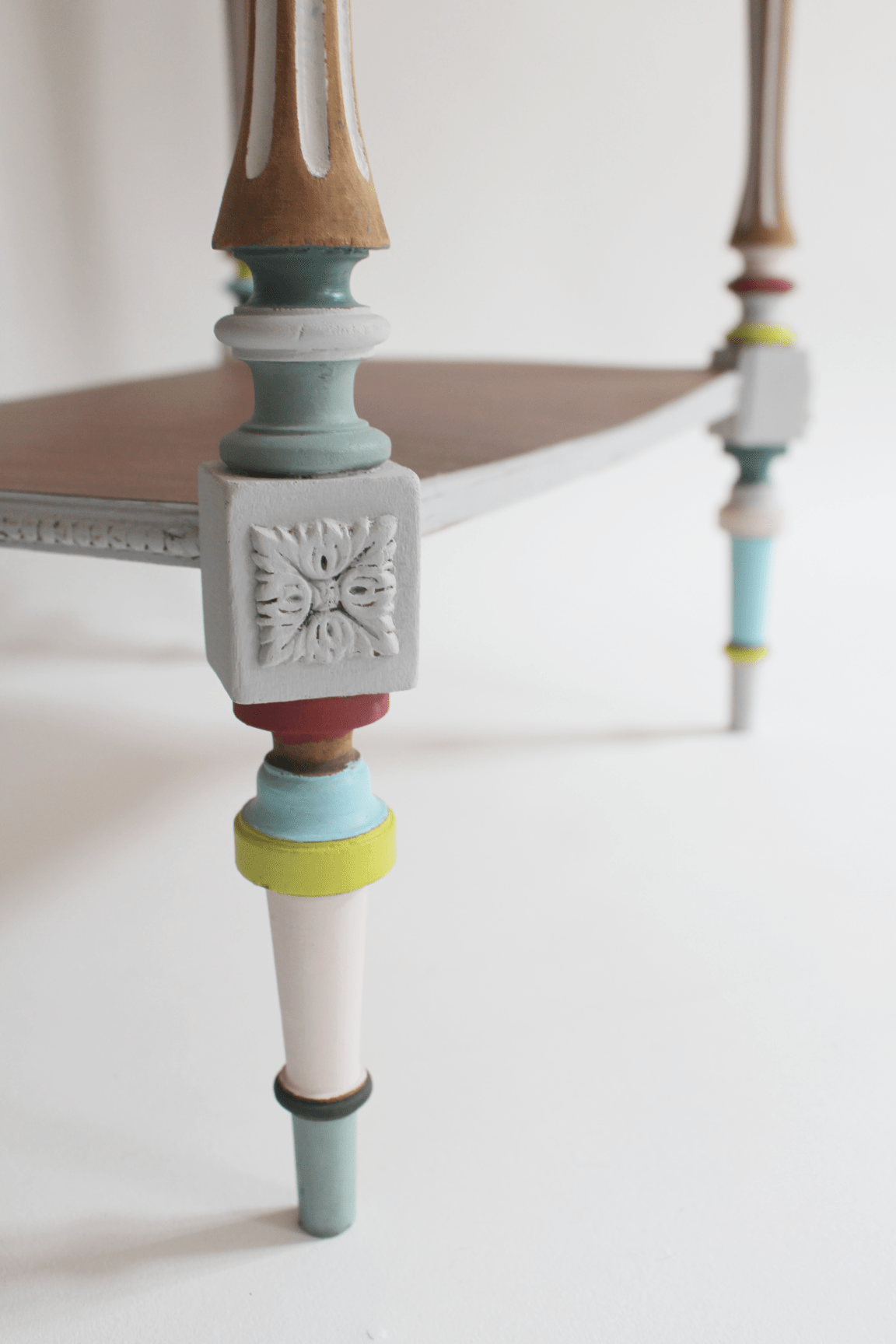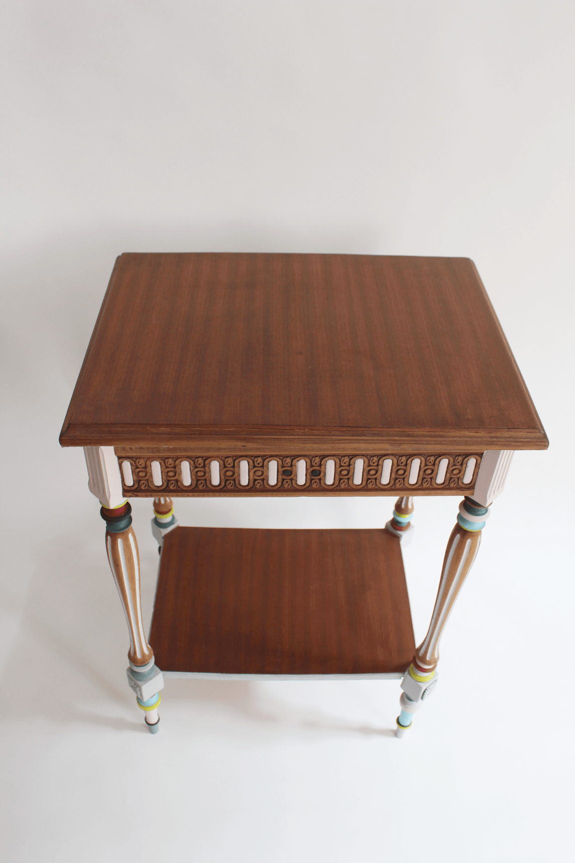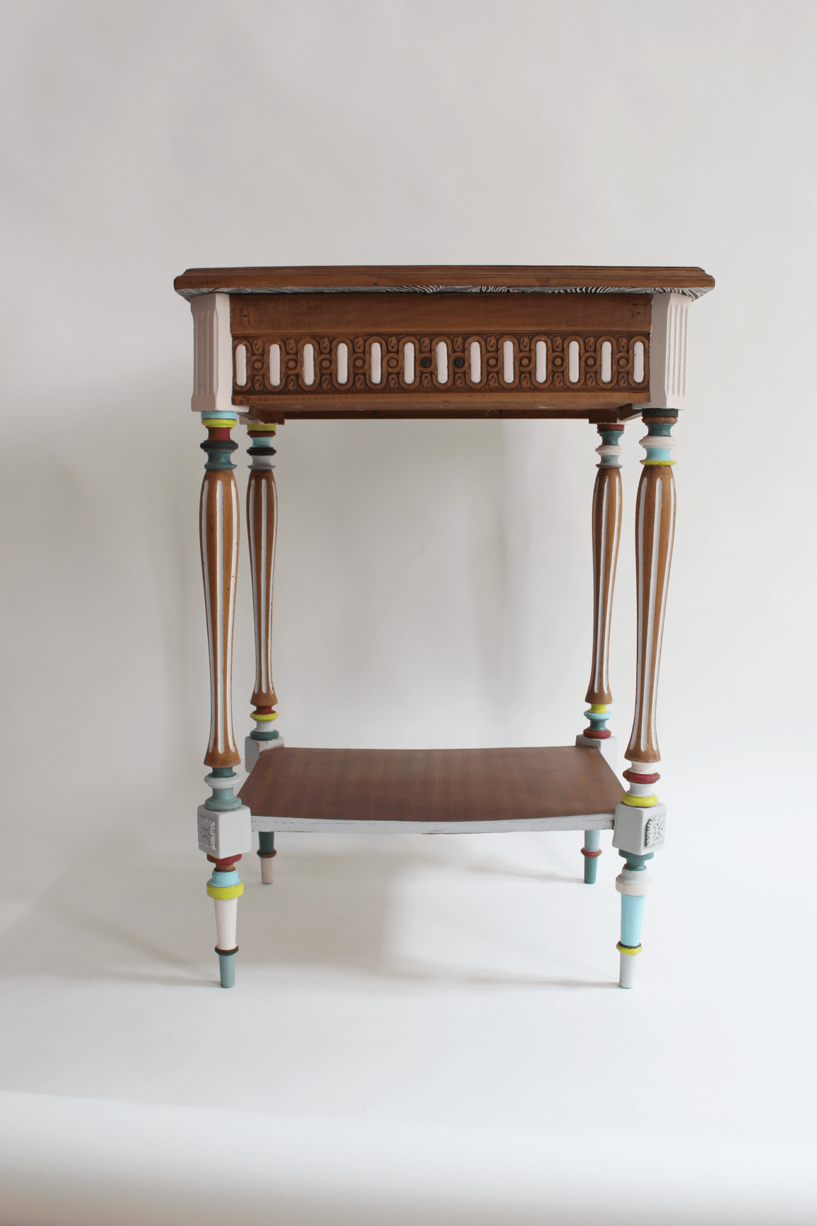 Entre chevet et secrétaire, ce meuble très ancien (fin XIXème siècle) est un véritable petit bijou. Ses sculptures d’origine très fines ont été soulignées avec des couleurs fraiches et modernes, les deux plateaux ont été recouverts d’une placage en acajou. Surprise: quand on soulève son clapet, il dévoile deux compartiments (autrefois utilisés pour ranger des bijoux, un nécessaire de beauté ou des lettres d’amour) et un miroir d’époque. Une pièce rare