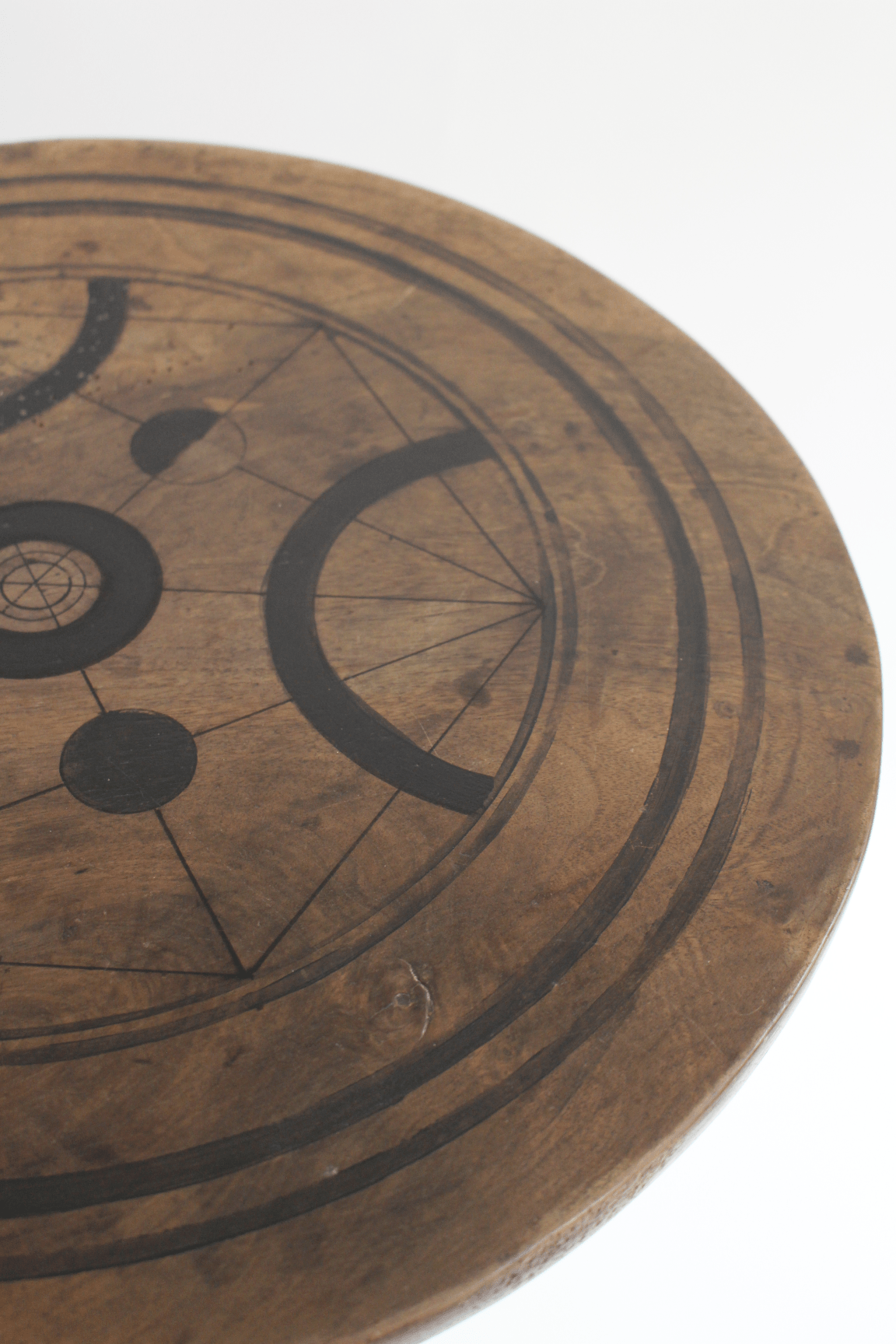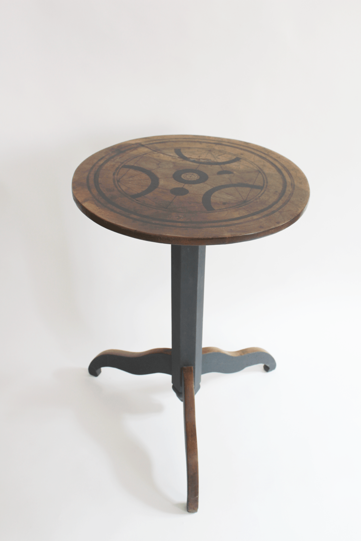 Un guéridon très ancien en noyer massif, restauré et décoré à la main.