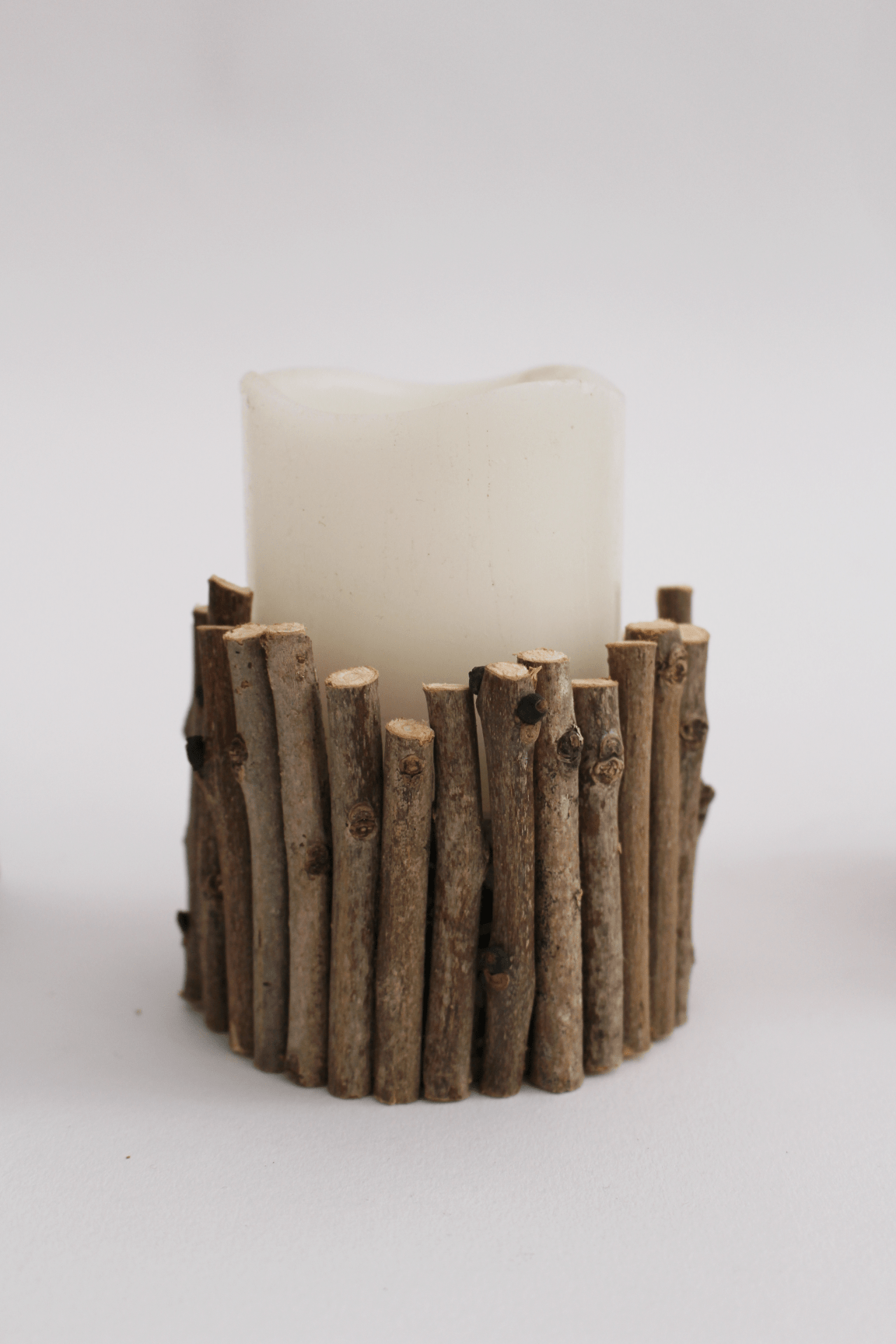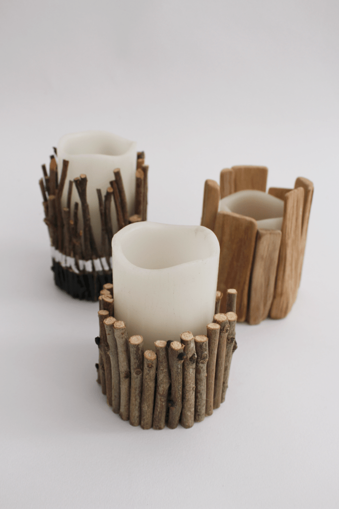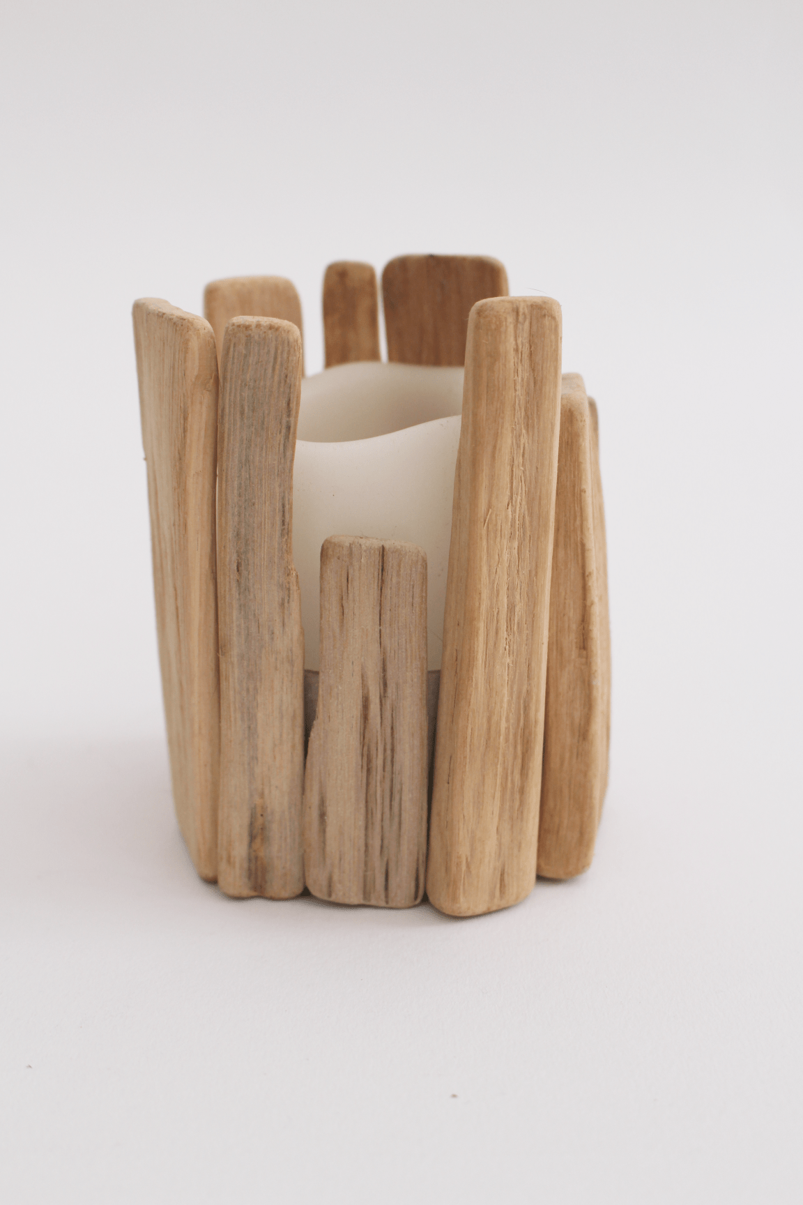 Des petits fagots de branches (chêne, hêtre, pin, acacia…) ramenés de la forêt. Ils contiennent une bougie LED en cire naturelle et on peut aussi y disposer un verre ou un petit vase de feuillage ou de fleurs… Diamètre 10cm.