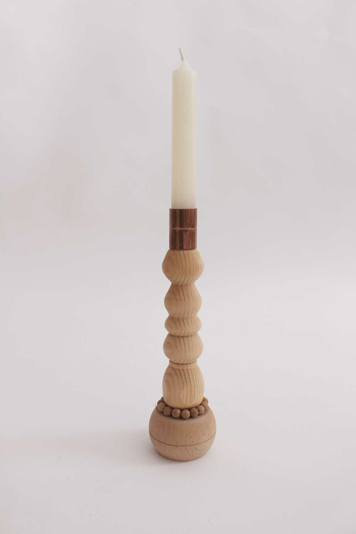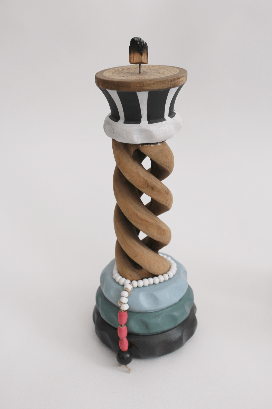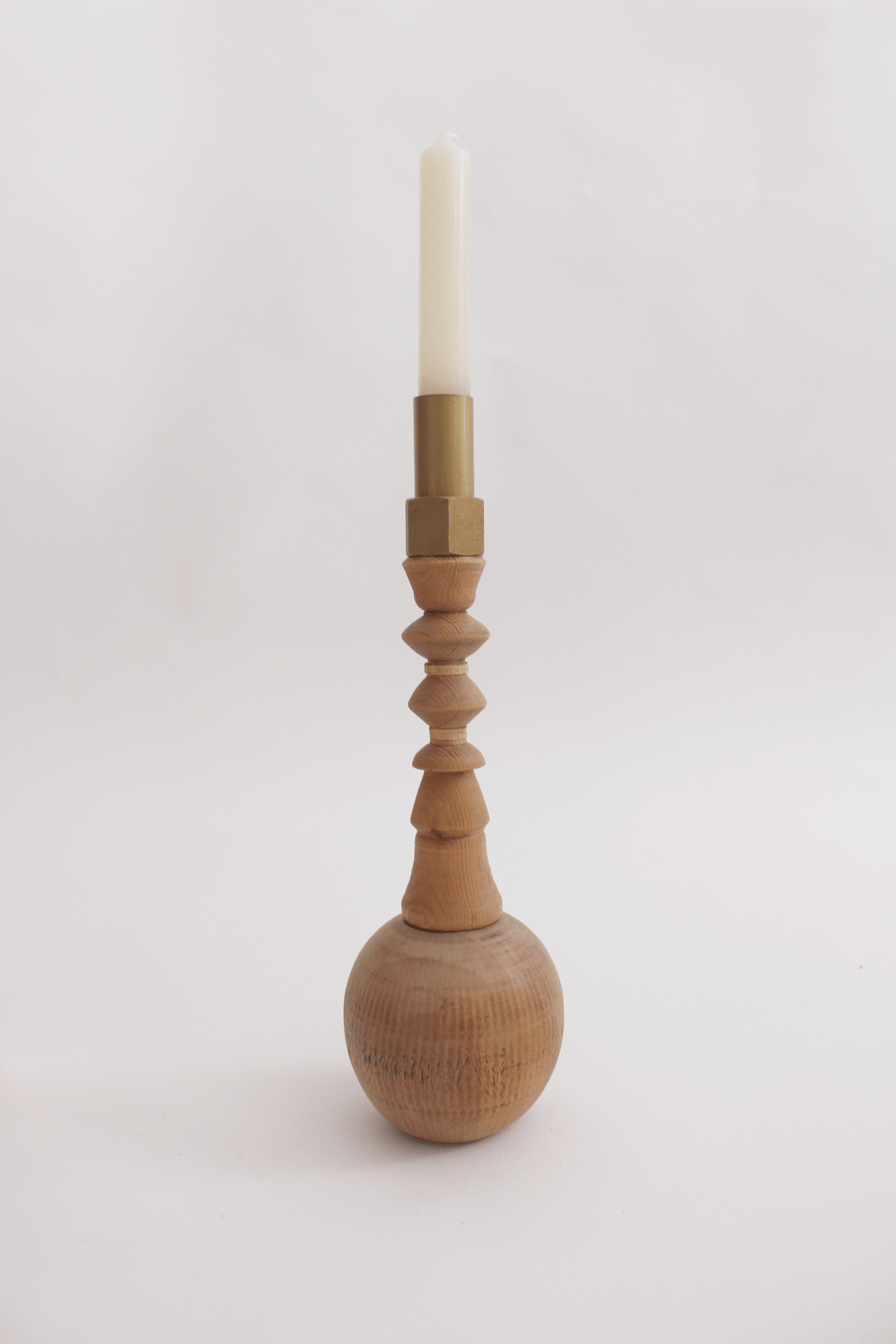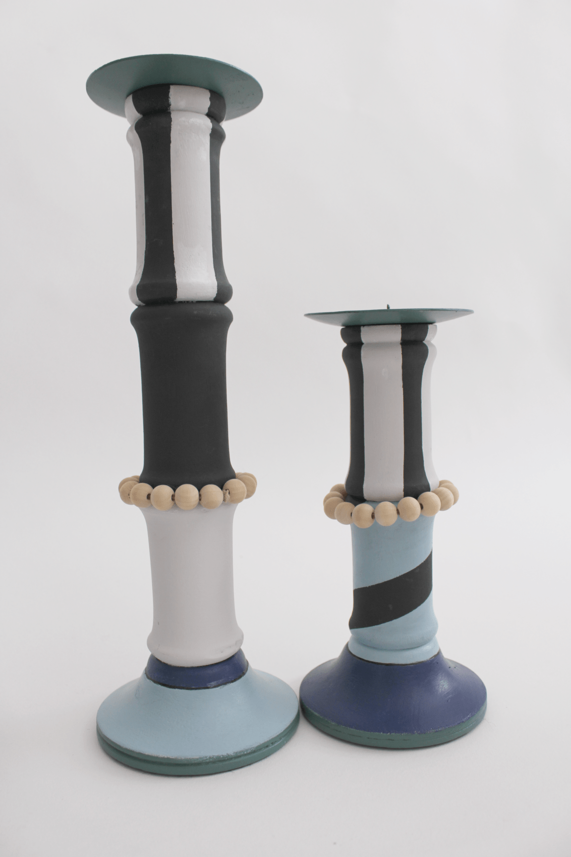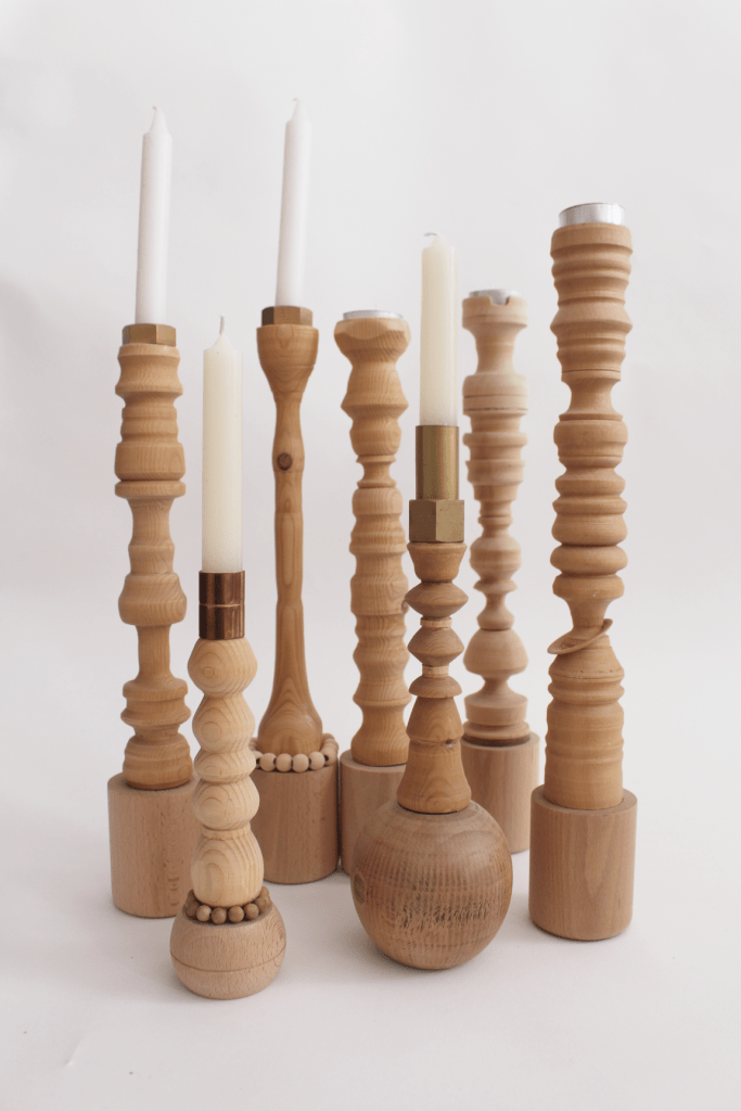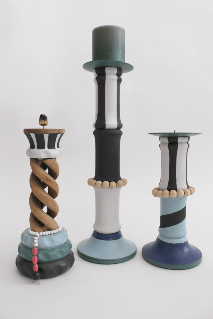 Des chandeliers anciens en bois tourné, revisités dans un style graphique. Ils peuvent accueillir des chandelles, des bougies XXL et même des bâtons de Palo Santo.